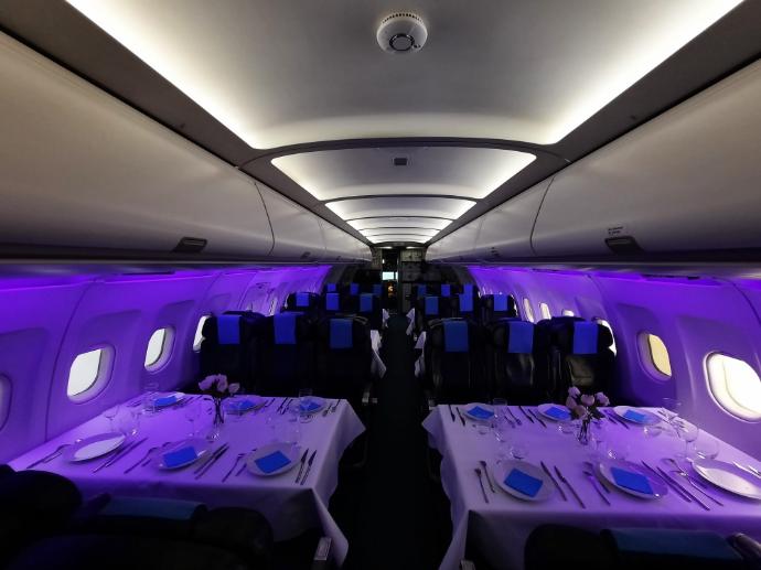 Dégustez un repas de haut vol à bord de l'avion sans ailes du Flylounge! Visites cockpit en fin de repas
